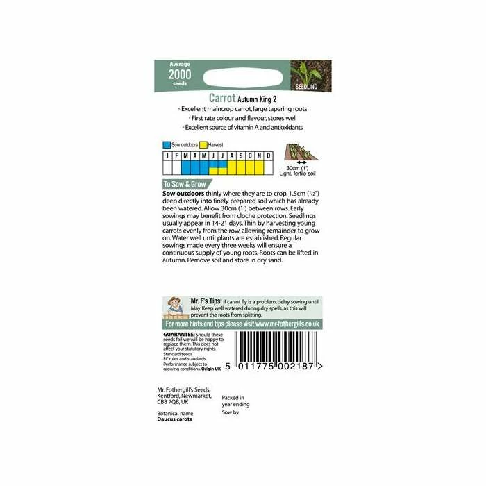 Our daucus carota Carrot “Autumn King 2” seeds produce high yields of short, broad carrots with a small core and intense orange colour. This popular maincrop variety have crunchy flesh and a fantastic flavour, and are a great source of Vitamin A, Vitamin C, and antioxidants. These carrots are easy to grow and rewarding, as home-grown carrots taste much sweeter than those bought in supermarkets. They can be harvested from a small size and have good storage capabilities.