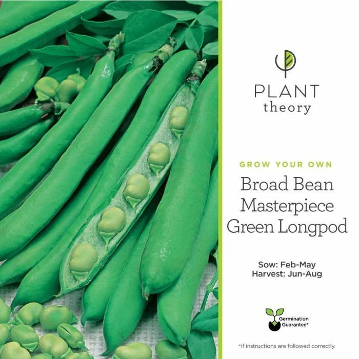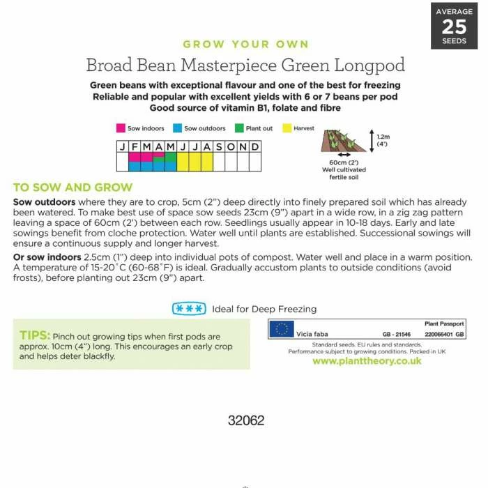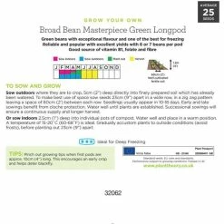 Our vicia faba Broad Bean “Masterpiece Green Longpod” seeds are possibly the best green-seeded broad bean variety. These reliable plants produce high yields of good-sized pods containing 6-7 large juicy beans. These beans have a great flavour and can be used as an accompaniment to a roast and cooked into a variety of dishes. This RHS AGM awarded variety is also excellent for freezing.